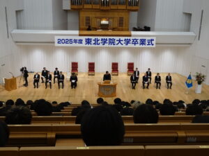 東北学院大学・大学院の卒業式及び同窓会入会式が開催されました2026.03.23 2026年3月23日(月)、東北学院大学・大学院の卒業式・修了式が執り行われ、 その後、同窓会入会式が開催されました。 新同窓生の皆様、東北学院同窓会への入会、おめでとうございます。 ようこそ、東北学院同窓会へ! 今後の人生に役立てられるよう、各地区の支部・TG会をはじめ同窓会諸活動への参加をお待ちしております。 【同窓会入会式】